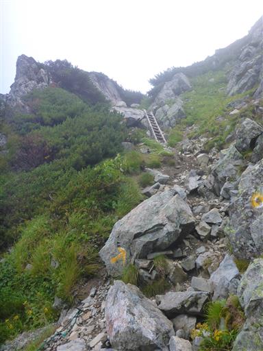 急峻な登山道とハシゴ。