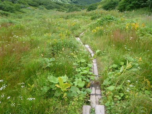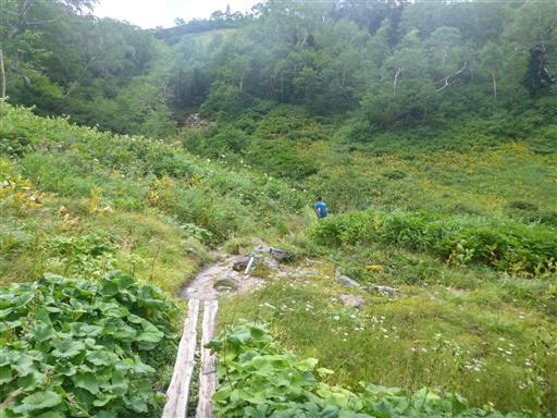 沢沿いに下って行くと傾斜が緩んできて木道が現れる。