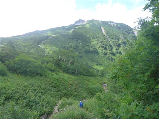 歩いてきた沢を振り返る。見えているのは祖父岳の辺りだ。