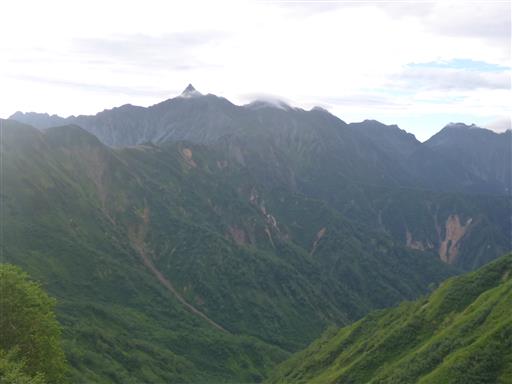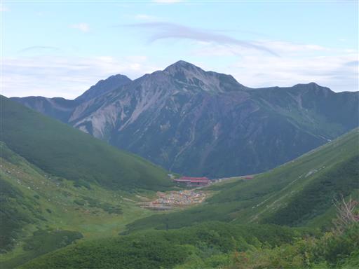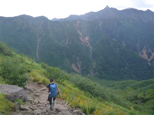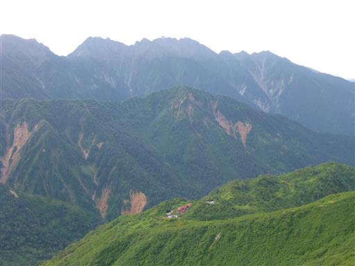 振り返ると鷲羽岳、水晶岳と双六小屋。これで見納めだ。