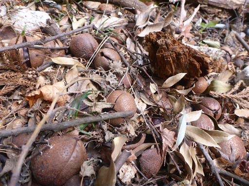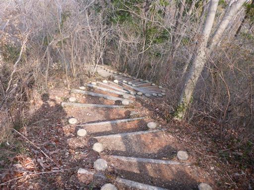大きな木が倒れていて、木の根によって階段が破壊されている。