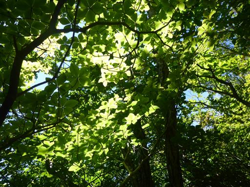 頭上を見上げると、葉が光を浴びて美しく光っている。