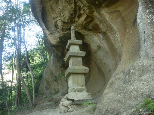 岩の庇の下に三重塔が建っている。