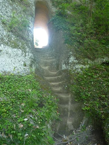 岩を掘ってできた階段。付近は苔に覆われている。