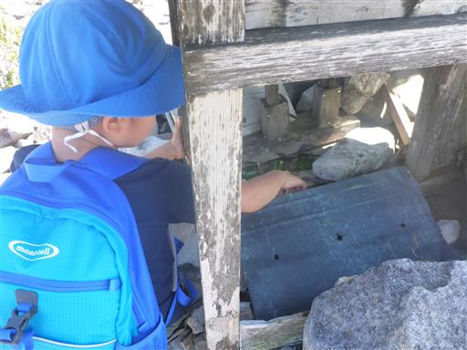神社に手を伸ばす息子。割れた瓶が散乱していて危ないので阻止。