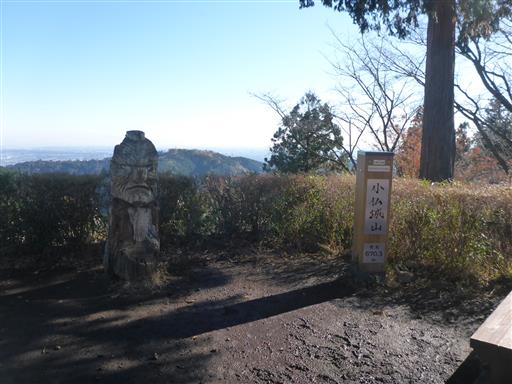 立派な山頂標識。近くの切り株が天狗の頭の形に彫られている。