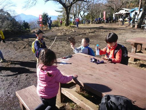 城山では椅子に腰かけてしばらくおやつタイムにする。