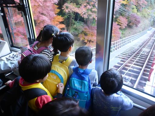 車両の先頭に陣取る。急斜面の路線が見えるので子供たちは大はしゃぎだ。