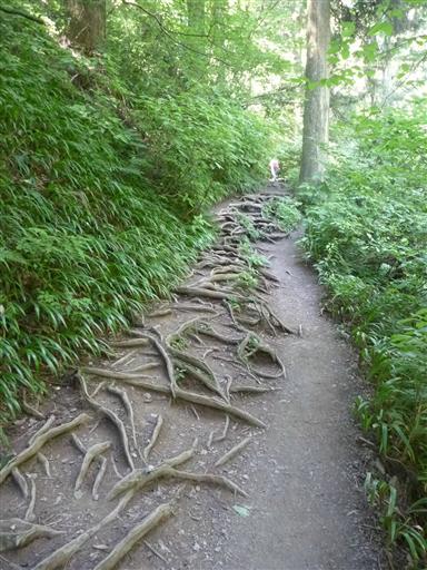 多くの登山者が通過するため、木の根が登山道に完全に露出している。