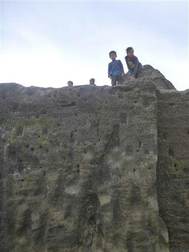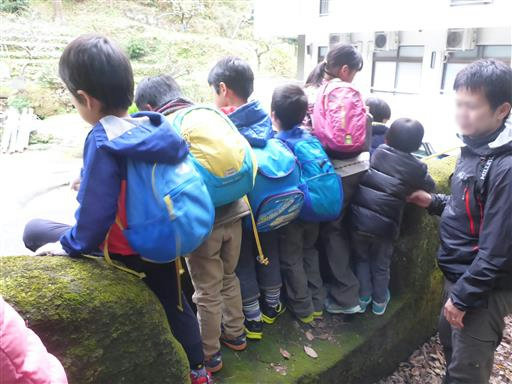 石の壁に段があったので子供達が登り出す。一人が登ると全員が登る。