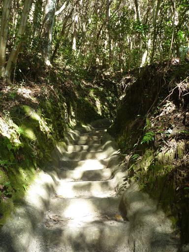 鳥居の先は古い階段が続く。苔に覆われているので滑りそうで少し怖い。