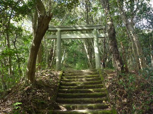 山の中腹に古びた鳥居が立っている。
