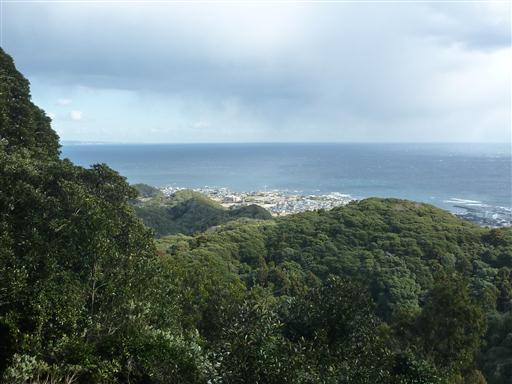 山頂は木に覆われているが、一角は樹林の切れ目があって真っ青な太平洋が望める。
