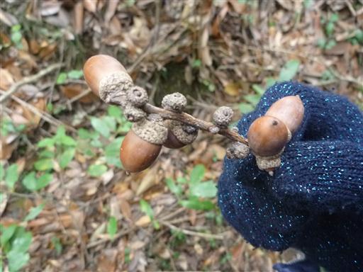 枝が折れたため、小さなドングリが枝に付いたままになっている。