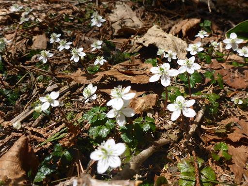 ミツバオウレンの花がたくさん咲いている。