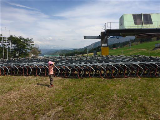 娘がリフトの椅子を見たいと言ったので見学する。大量の椅子が並んでいる。