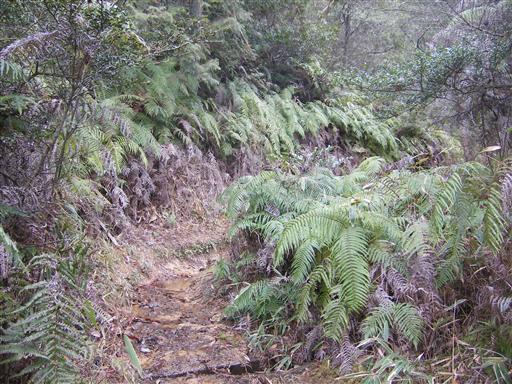 下っていくと、落葉樹はなくなり緑色のシダが生い茂る。