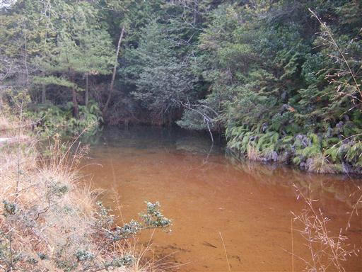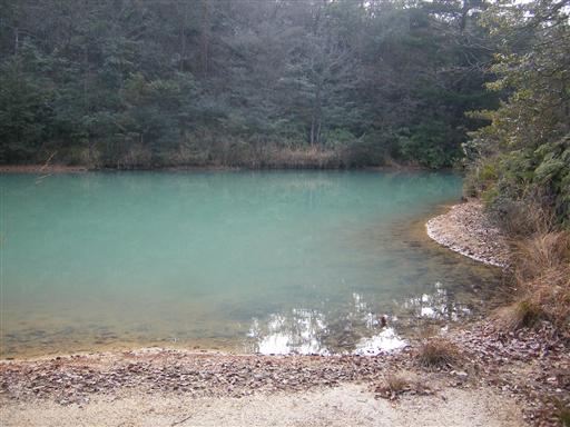 奥は緑、手前は赤の二色にくっきり分かれたカラフルな池。