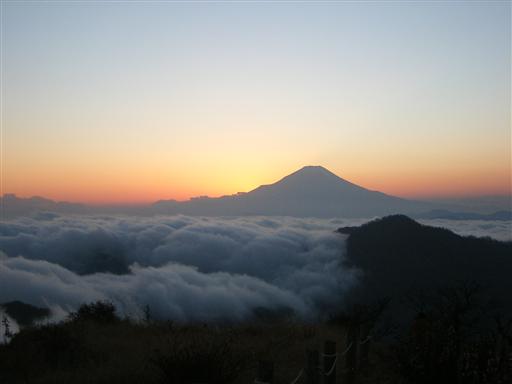 夕日が沈むと、雲海の向こうに富士山のシルエットがきれいに浮かび上がる。