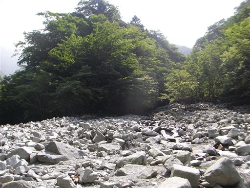 白い石が重なる河原に出てくる。西丹沢はなぜか白い河原が多い。