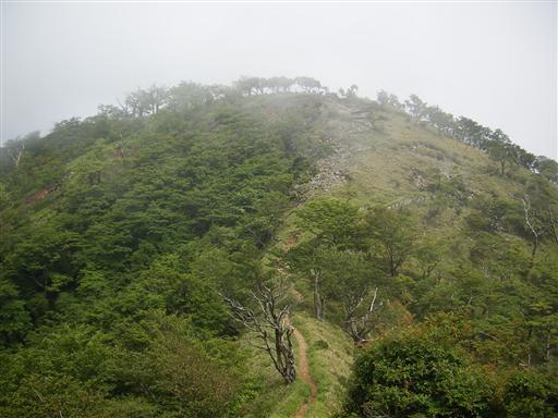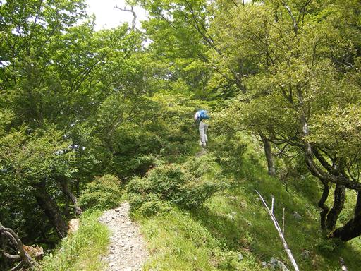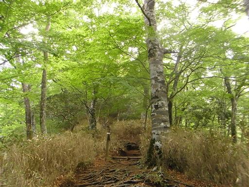 しばらく歩くと尾根道になり、辺りにはブナ林が広がる。