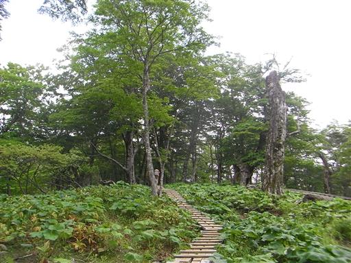 木道の脇にはマルバダケブキが群生している。まだ花は咲いていない。