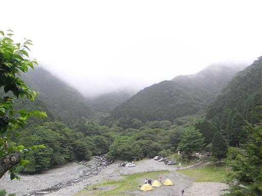 下山地点にはキャンプ場がある。丹沢の山々は低い雲に完全に覆われている。