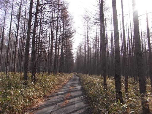 付近は植林されたカラマツ林が続く。ここから登山道入口までが長い。