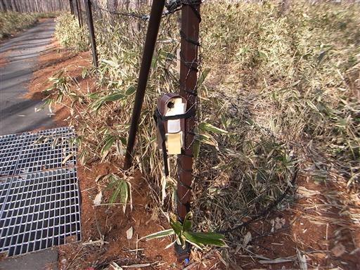 鹿監視用のカメラが設置されている。左にある網は鹿を通れなくするためのものらしい。