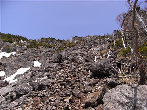 途中で雪を避けるため、ガレ場を登っていくことにする。