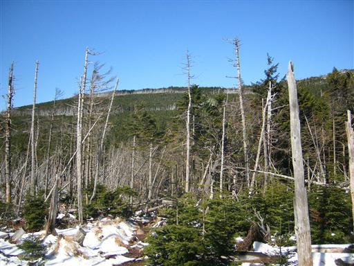 山の斜面には立ち枯れた木が帯状に広がっている。