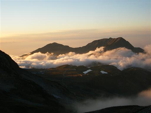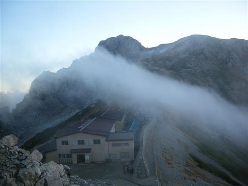 鞍部にあるこの小屋は風の通り道で、雲が通り過ぎていく。
