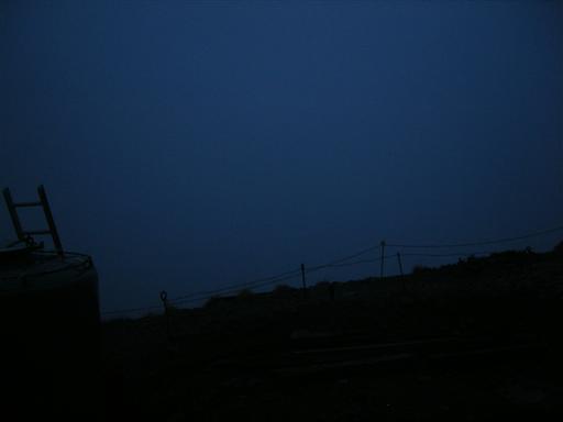 未明。小屋の屋根をたたきつける雨の音と、風の音が激しい。