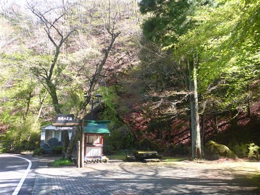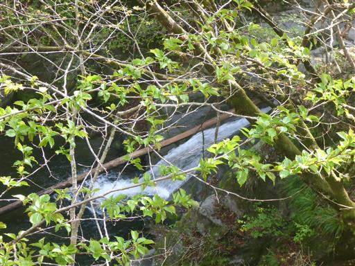 逢瀬の滝。木が生い茂っていて、よく見えない。
