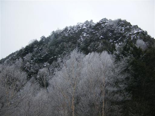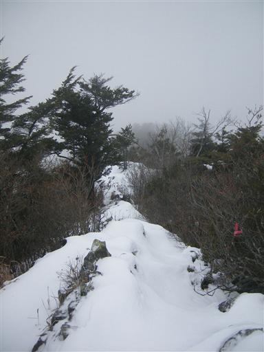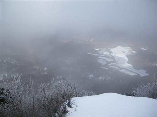 切れ落ちた稜線から下を覗くと真白に染まった美しい木々が見える。