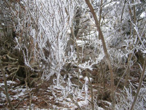氷が無数のとげのように樹木から生えている。