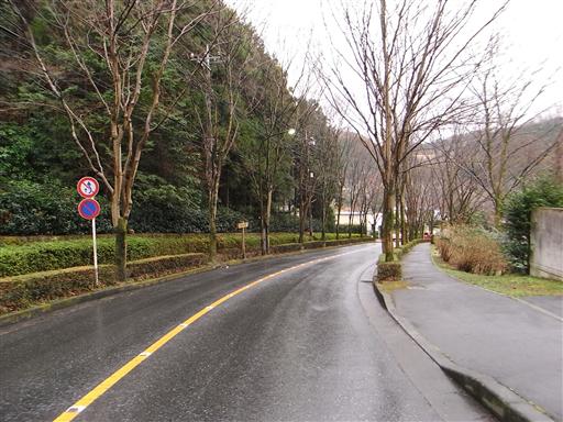 道は遊歩道のようにきれいに整備されているが、雨が降っていることもあり人影はない。