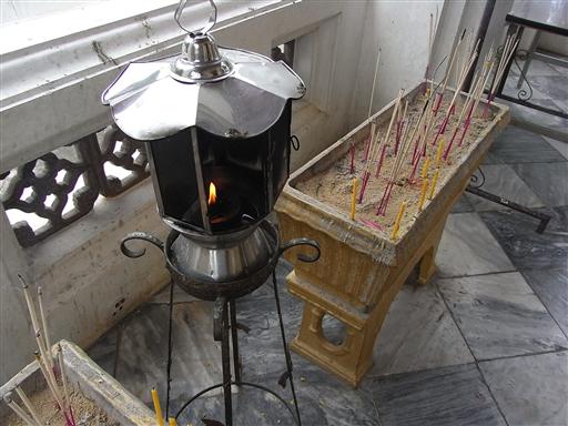 礼拝堂の入口付近にロウソクと線香が立っている。