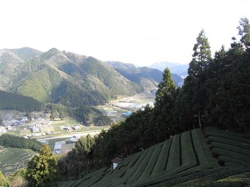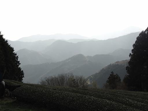 茶畑からは霞んだ山々が幾重にも重なって見える。