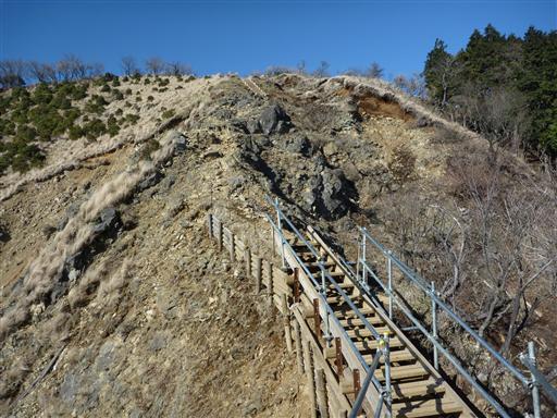 崩れ落ちそうな狭い稜線には木の階段が設けられている。