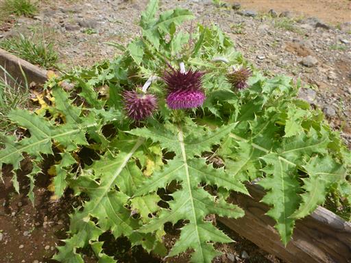 アザミは登山道のいたるところで生えていて、足が葉に触れると痛い。