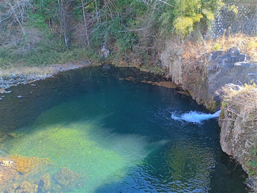 車道の左手に大きな淵が現れて目を引く。なぜこんな大きな淵ができたのか不思議だ。