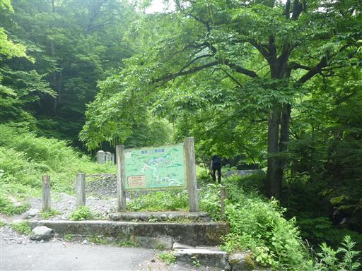 1時間ほどの車道歩きで登山道入口に到着する。すでに何台かの車が停まっている。