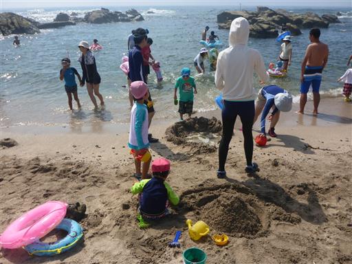 子供達は砂場が好きなのに、砂浜の砂は粒が荒いからか、少し嫌がっている。