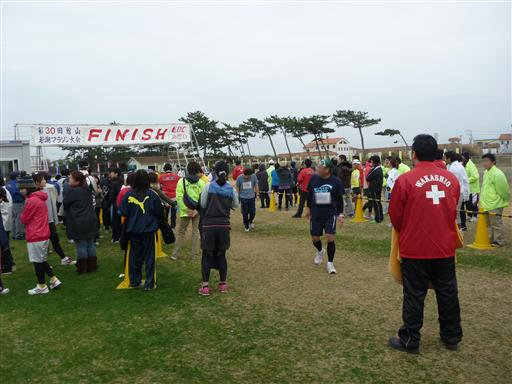 右足を引きずりながら何とかゴール。タイムは4:03:12だった。シートに戻ってみたが誰もいない。まだ誰もゴールしていないようだ。再びゴール付近に戻ってしばらく待つと、2人目がゴールイン。12分差の薄氷の勝利だった。あとのメンバーはいつ来るか分からないのでシートに戻って、振舞われているトン汁やクリームパンを食べながらのんびりと待つ。空には雲が広がってきて寒い。4時間45分で3人目がゴール、5時間30分、40分で2人が立て続けにゴールし、全員が無事完走できた。