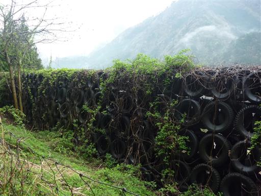 タイヤが並んだ巨大なバリケード。落石を防ぐためのものだろうか?