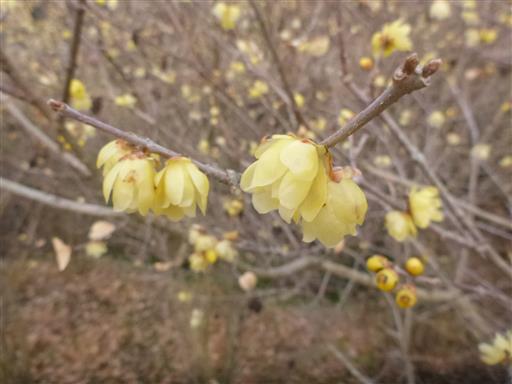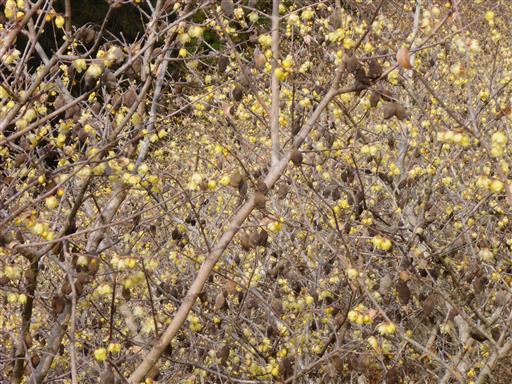 多くのロウバイが咲いているが、茶色い実と混ざっていて少々見た目が悪い。