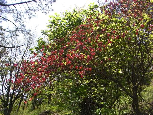 赤い花のつぼみがたくさんできている。ツツジ系の花だ。