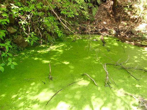 緑色に染まった水たまり。細かな葉がたくさん浮いている。