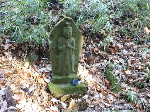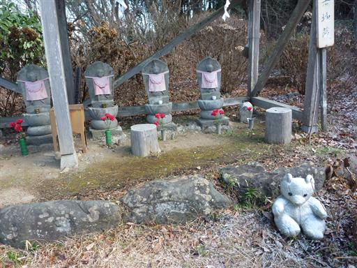 車道脇に六地蔵と、なぜか熊のぬいぐるみが置かれている。